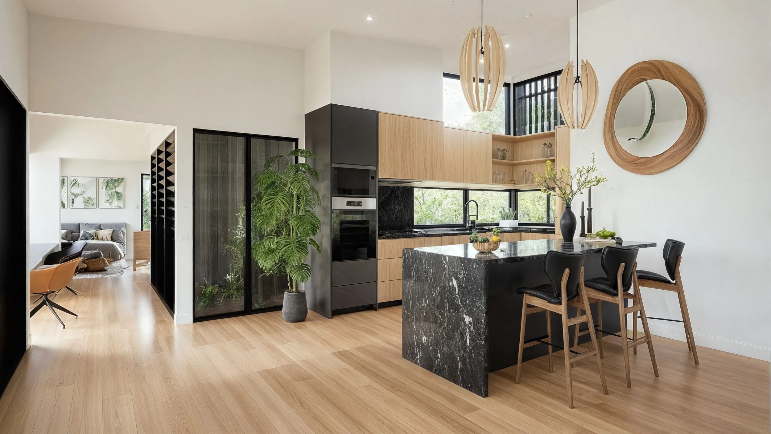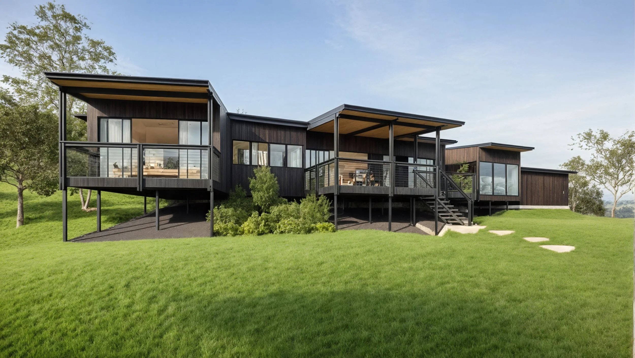 A two-bedroom holiday house or weekender retreat for a hinterland block. Designed to work with the contours of the land. Contemporary cladding and heka hoods for a modern barn look.
