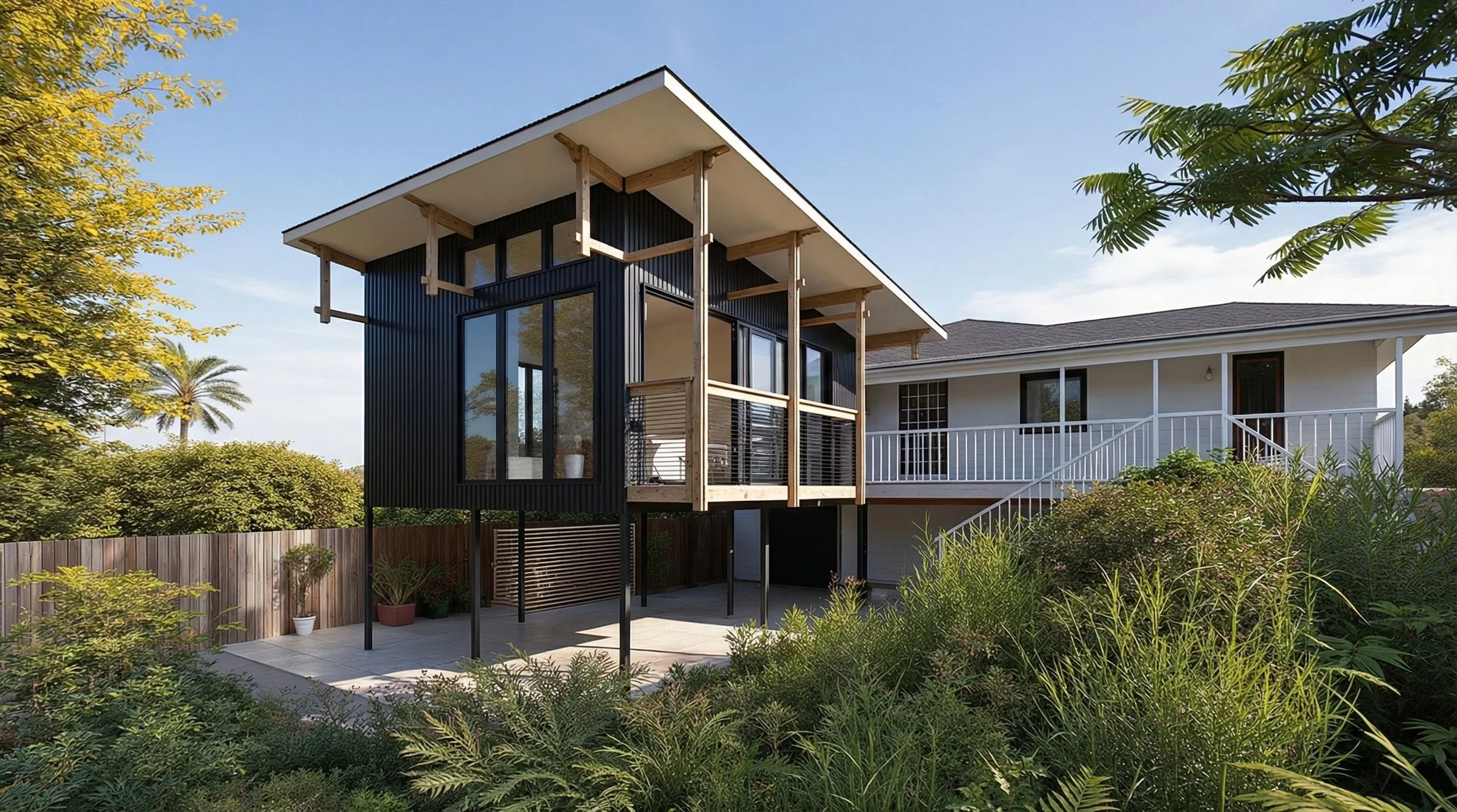 The Breton Dwarf is a small extension to provide an additional bedroom, robe and ensuite connecting to the existing house. Like the image shown this can be raised for a 2 storey or added as a single level option.
