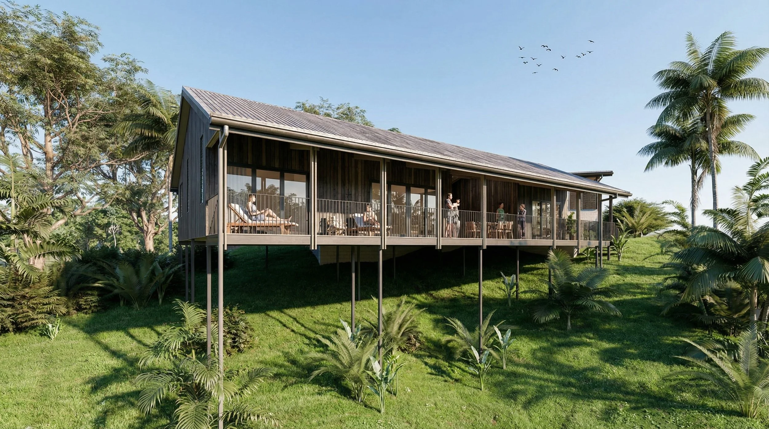 Harri is a 2 bedroom, 2 bathroom elevated house design with open plan living and a large entertaining deck area. An aesthetic design featuring external cladding to blend in with the landscape. The original design as shown in the 3D model below is raised to suit the client’s sloping property and accommodate a carport.